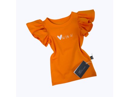 Dívčí triko s volánovými rukávy – „Áj láv jů“ Rozzařte den vaší malé princezně tímto veselým trikem v zářivě oranžové barvě! 🧡Stylové dívčí triko s volánovými rukávky a...