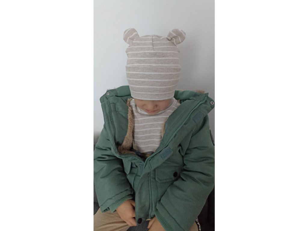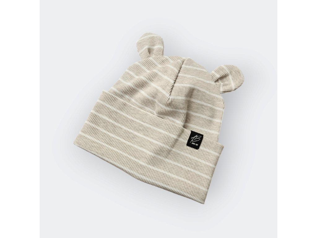 Tato roztomilá dětská čepice v jemném béžovém odstínu s decentními proužky je nejen stylová, ale také praktická. Díky měkkému a pružnému materiálu skvěle sedí na hlavičce a poskytuje maximální pohodlí. Roztomilá ouška dodávají čepici hravý vzhled, který si zamilují děti i rodiče.