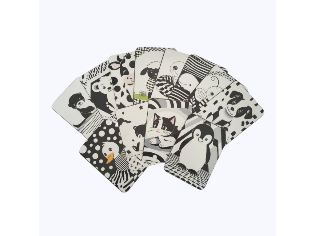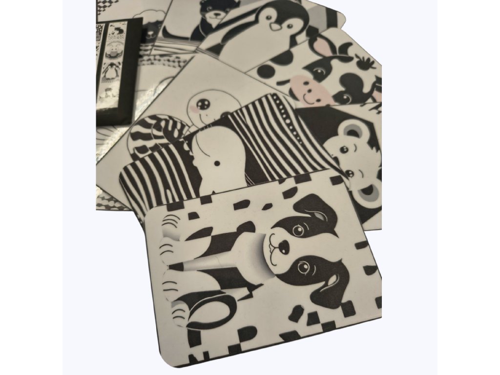 Tyto edukační karty v černobílém provedení byly navrženy speciálně pro novorozence, kteří v prvních týdnech života rozeznávají právě vysoký kontrast – a ten nejlépe stimulují právě černá a bílá.