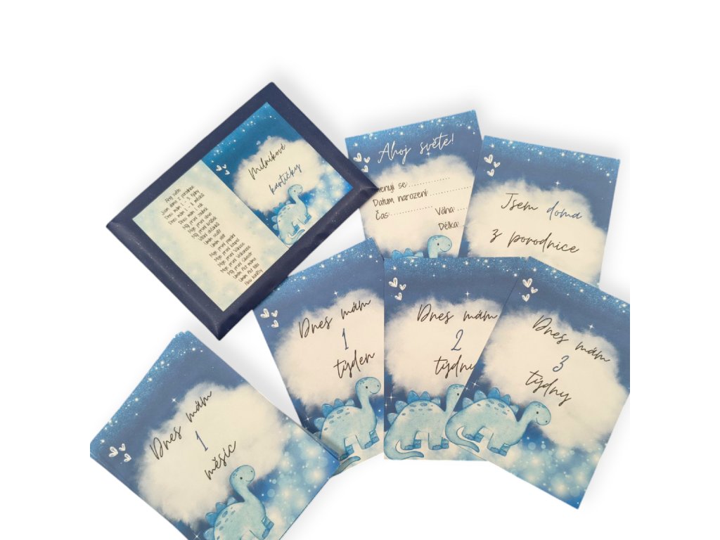 Milníkové kartičky s roztomilým dinosauřím motivem v jemných modrých tónech jsou ideálním pomocníkem pro focení a uchování vzpomínek na důležité milníky v životě vašeho dítěte.